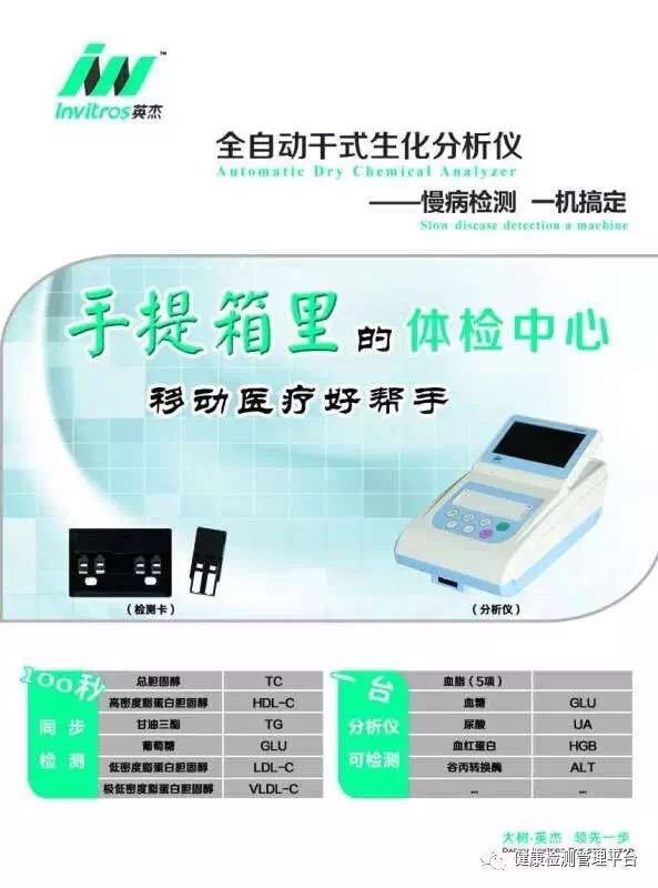 南京大樹(shù)英杰——全自動(dòng)干式生化分析儀,100秒同步檢測總膽固醇、高密度脂蛋白膽固醇、甘油三酯、葡萄糖、低密度脂蛋白膽固醇、極低密度脂蛋白膽固醇,尿酸,血紅蛋白和谷丙轉氨酶。手提箱里的體檢中心,移動(dòng)醫療好幫手。!